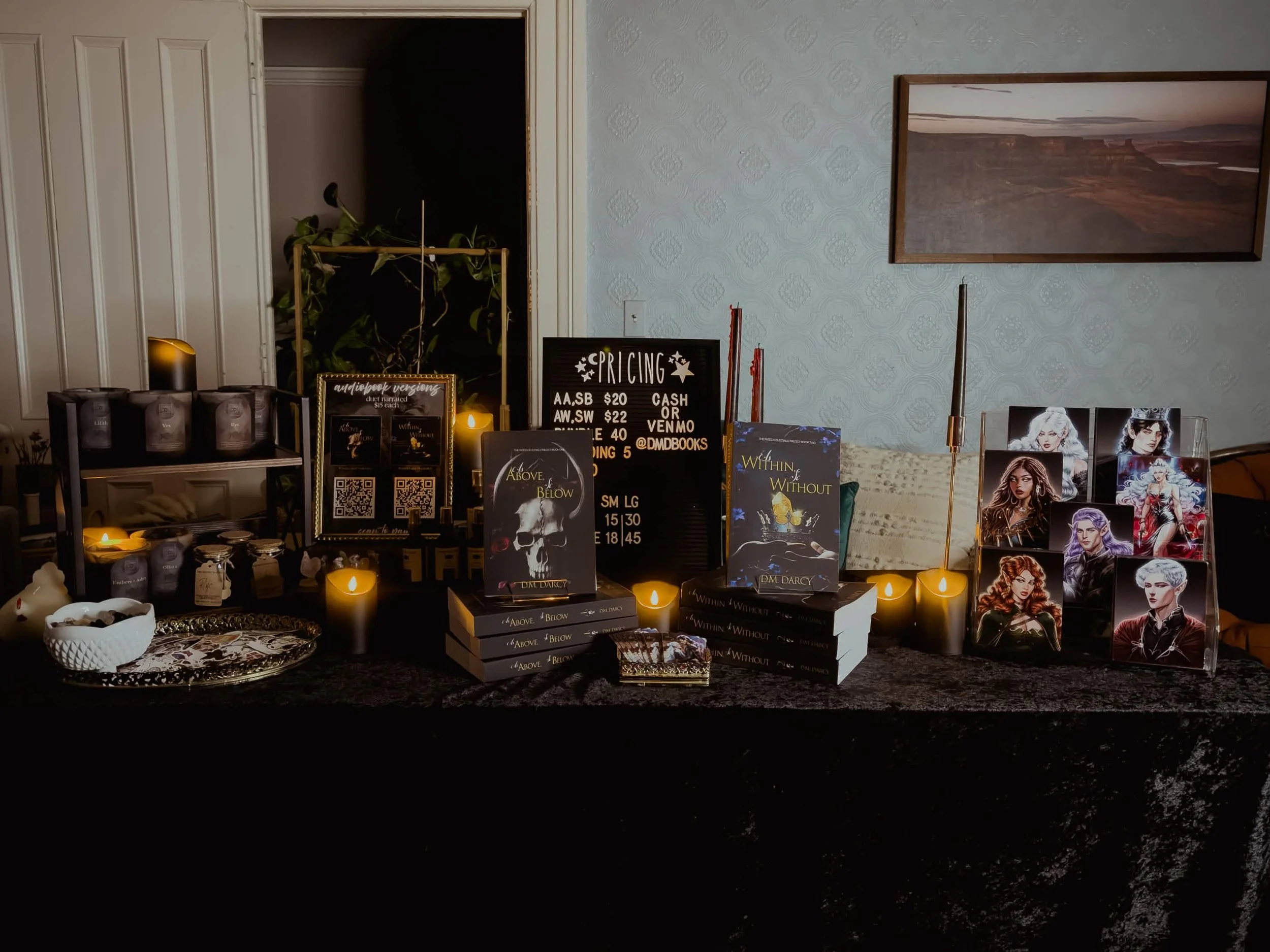 Of course I needed decor. I needed my table to have the same vibe as my work: dark, ethereal, fantasy-like. So here’s where I got to have a little fun and showcase my ability as a visual artist.