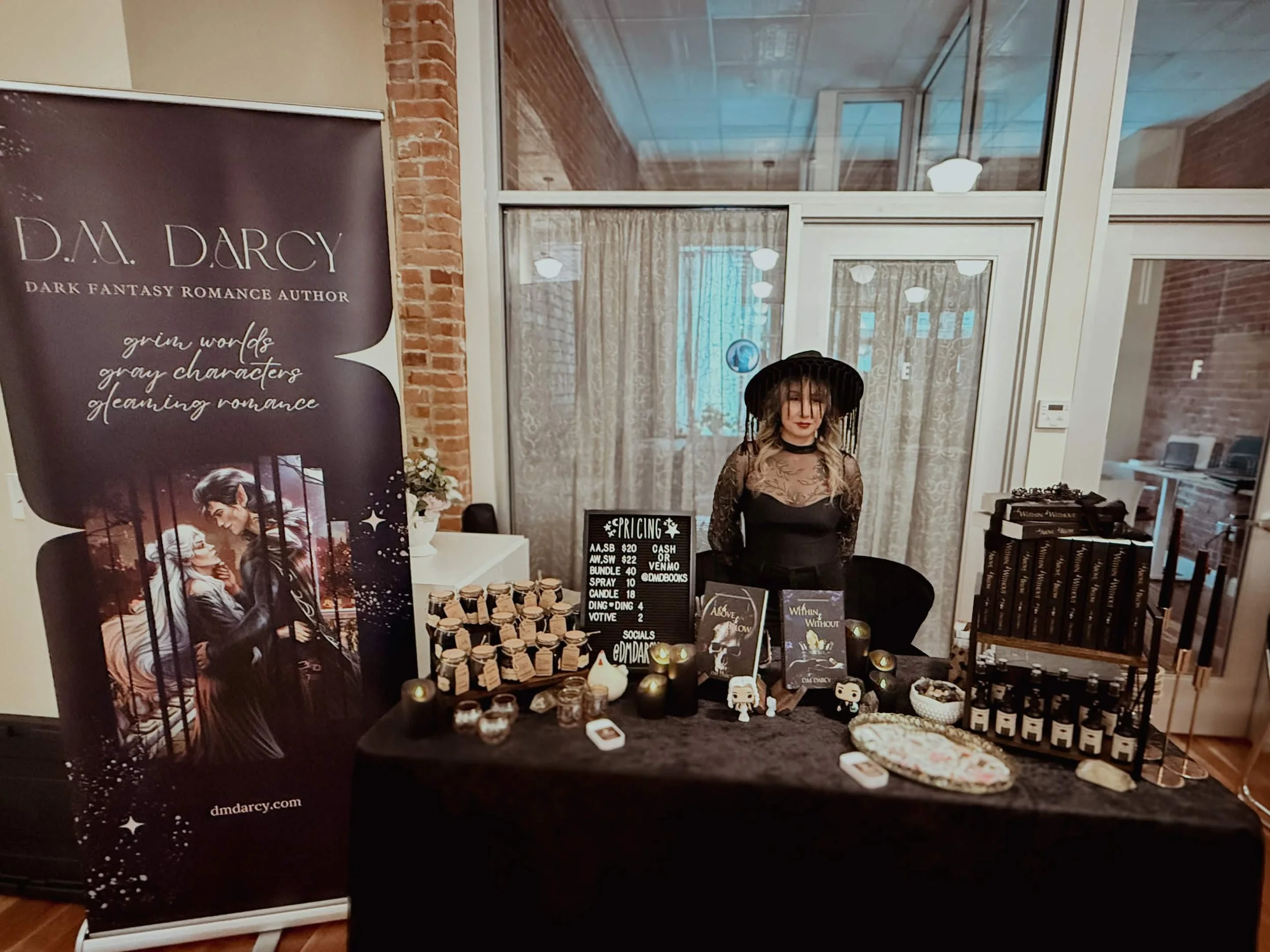 And it doesn’t include book stock, the table cost for an event (which varies), the crystal ding-dings, or the cost for the candles and room sprays I had made. BUT… the trade off was a distinct look, a means to (ideally) stand out from the other authors in attendance and be memorable. And that can help boost sales later—a reader who isn’t quite ready at the event might be in a few days (after reading reviews, talking with friends, etc.) if they were inclined to stop at my table and snag a card. (I’ve even had a few readers ask for photos with me because of my table and the way I was dressed—which of course matched the aesthetic—despite being a largely unknown author.)
